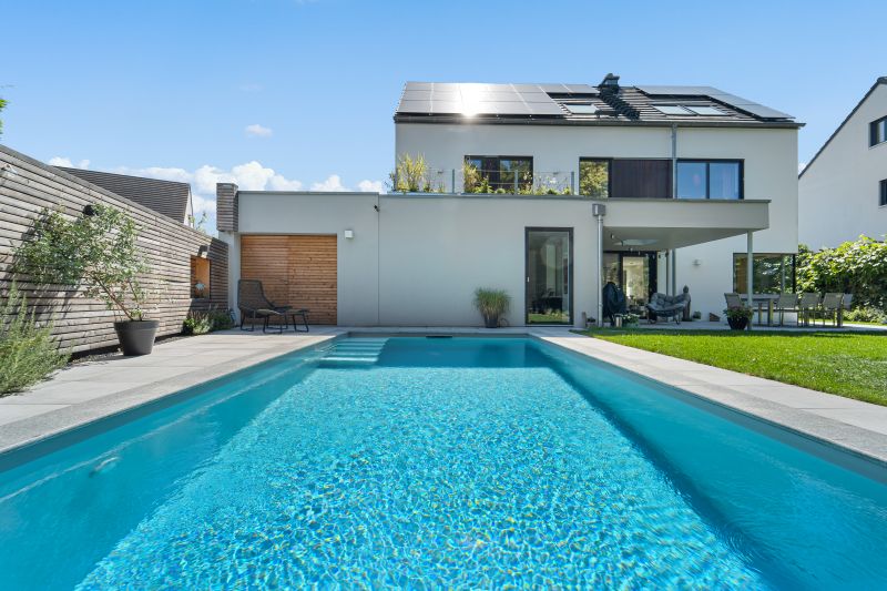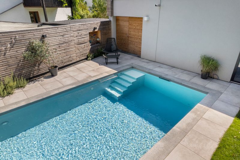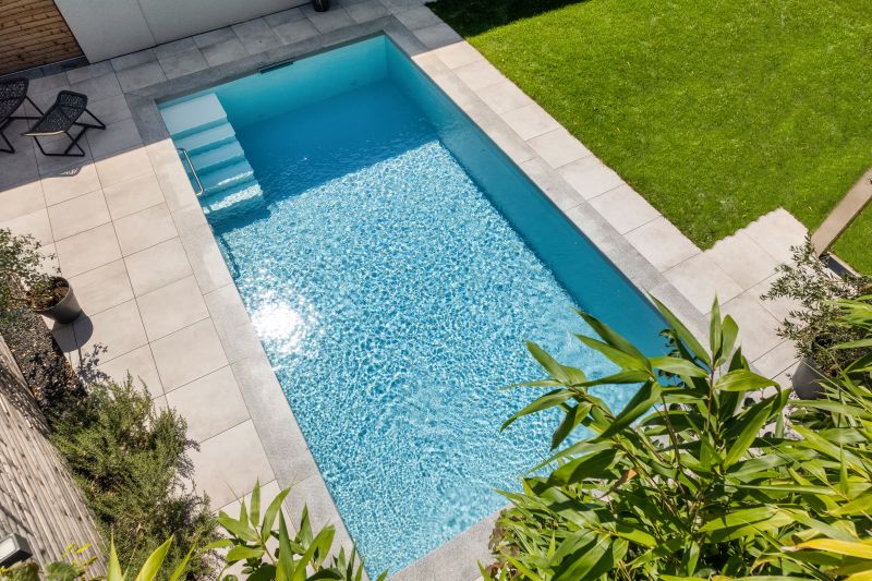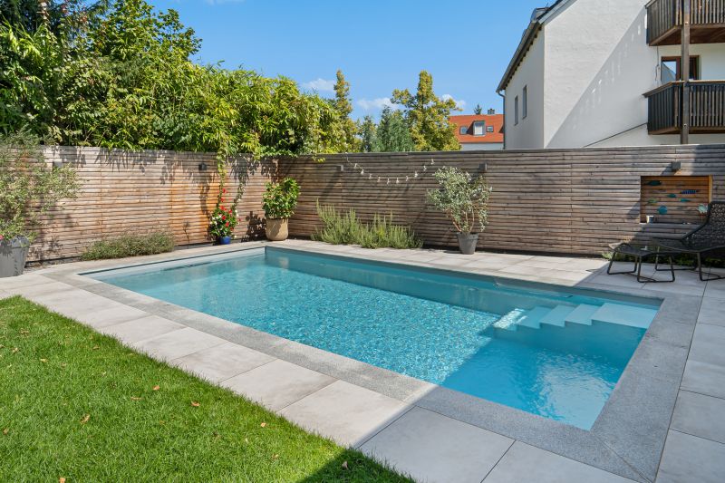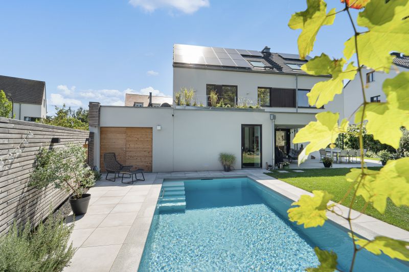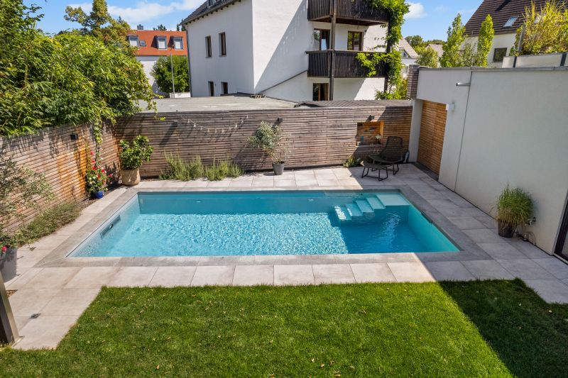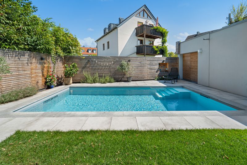 Das hellgraue Polystone Schwimmbad funkelt in sattem hellblau. Es verfügt über eine integrierte Treppe mit abgesetzten weissen Stufen und ist 8,00×3,50m groß und fügt sich dank guter Planung perfekt in den Garten ein. Dank des High-Level-Skimmers wird ein sehr hoher Wasserstand erzielt. Groß und klein dürfen Ihre Kräfte an der BINDER Turbinen-Gegenstromanlage messen. Für hygienisch reines Wohlfühlwasser sorgt dabei die vollautomatische OSPA-Filteranlage. Eine energieeffiziente Full-Inverter Wärmepumpe in Verbindung mit einer Photovoltaikanlage sorgt für eine nahezu kosten- und emissionslose Beheizung des Pools von April-Oktober. Das Becken wurde eingefasst in 130x33cm große Granitpoolrandplatten mit Halbrundstab an der Beckeninnenseite. Angrenzend dazu wurde 60x60cm Feinsteinzeug verlegt. Mit 2 edlen Unterwasserscheinwerfern wird das Becken perfekt beleuchtet. Ein sensationelles Ergebnis.