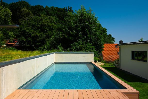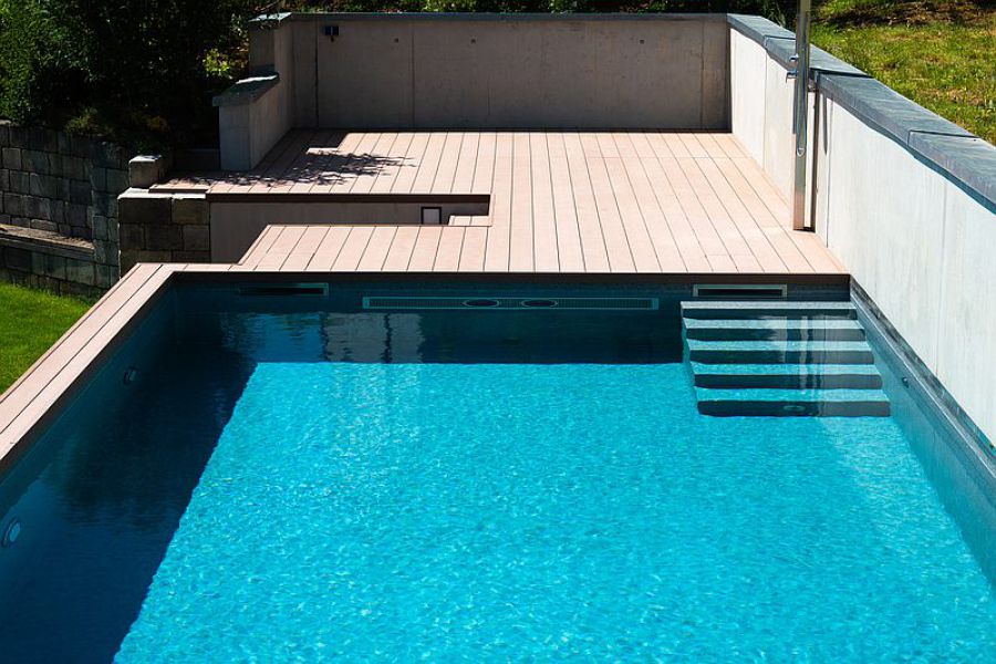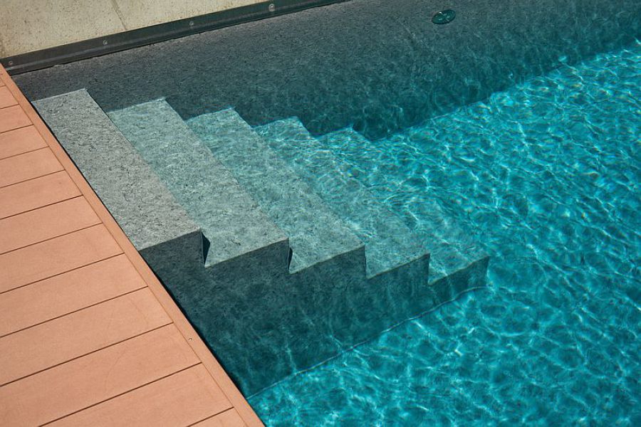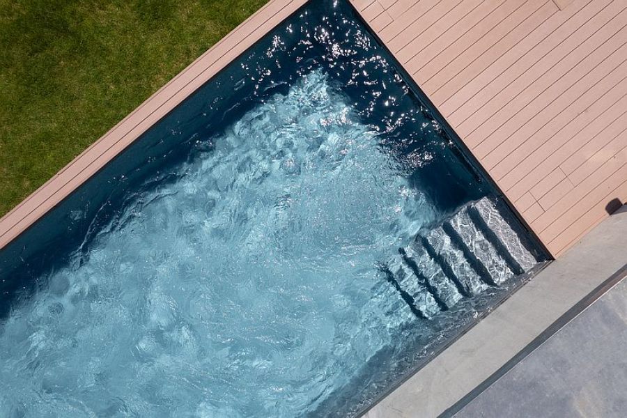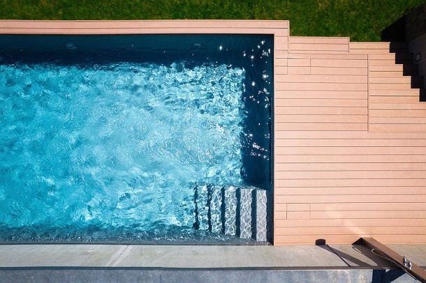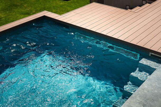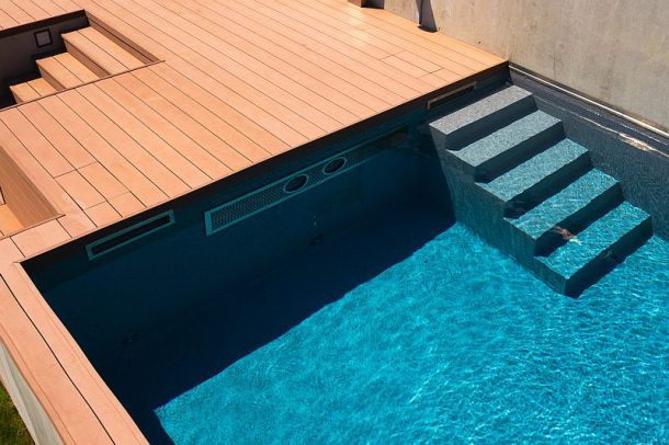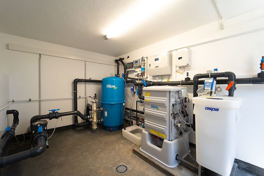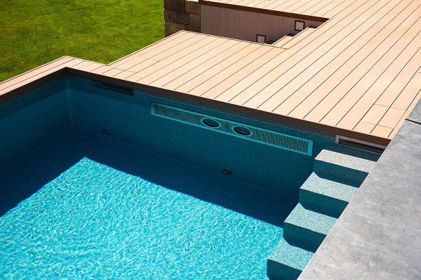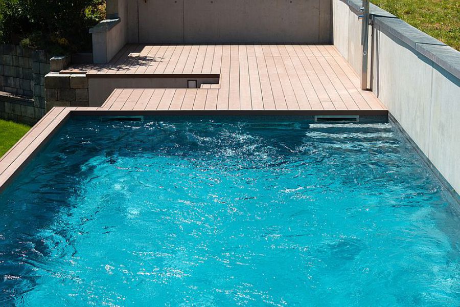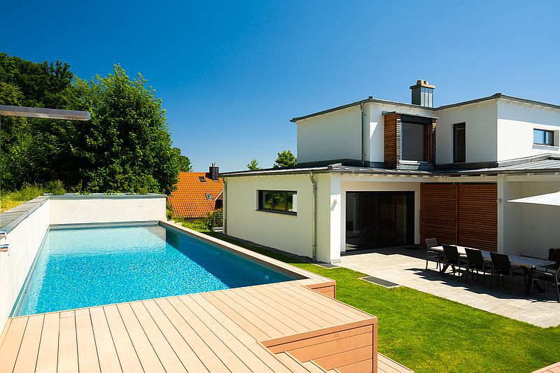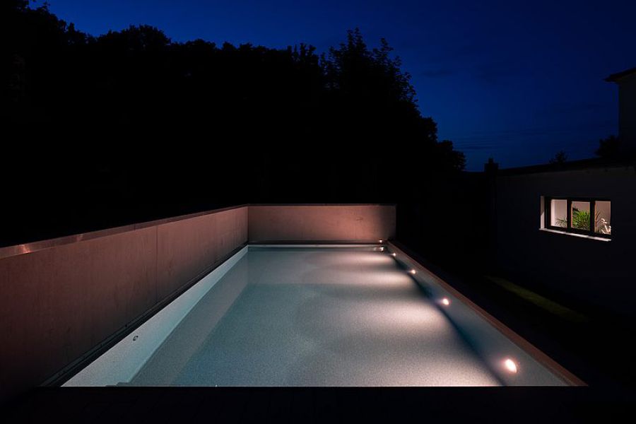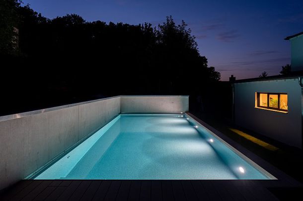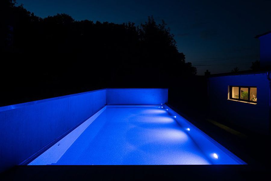 Dieser Pool ist die perfekte Kombination aus Entspannung und Funktionalität. Mit optimaler Wassertemperatur und modernster Ausstattung ist er ideal für aktive Regeneration, Schwimmtraining oder einfach zum Abschalten. Ein Ort, an dem Körper und Geist neue Energie tanken können. Das beheizte Schwimmbad mit den Maßen 11×4 m verfügt über eine integrierte Turbinen-Gegenstromanlage die neben der sportlichen Herausforderung auch ruhiges Schwimmen ermöglicht. Für hygienisch reines Wohlfühlwasser sorgt dabei die vollautomatische Ospa-BlueClear-Anlage. Die Schwimmbadabdeckung wurde in einem Rucksackschacht verbaut und fährt nahezu unsichtbar aus einem kleinen Schlitz in der Beckenwand.