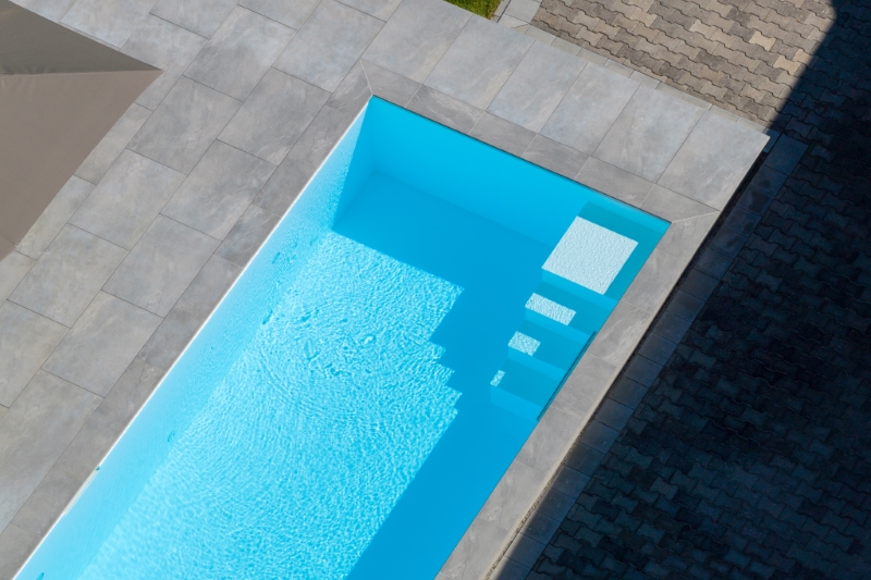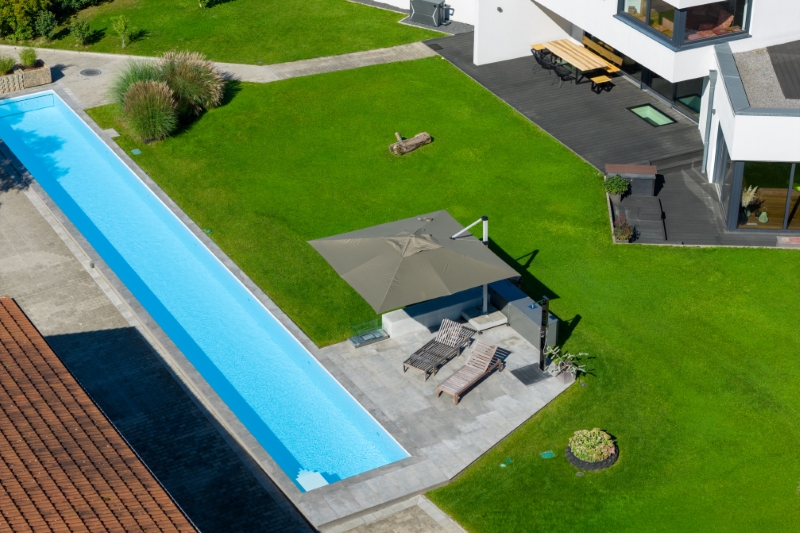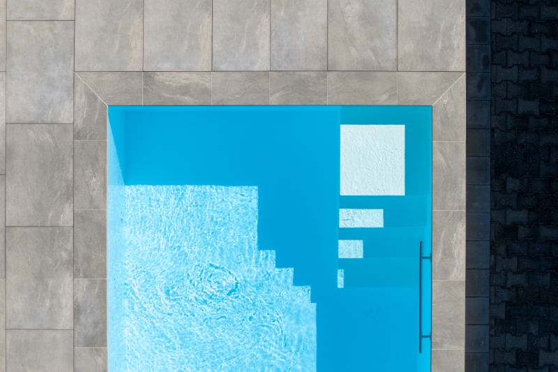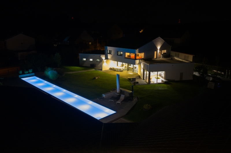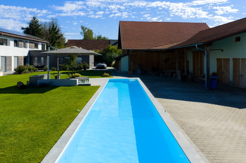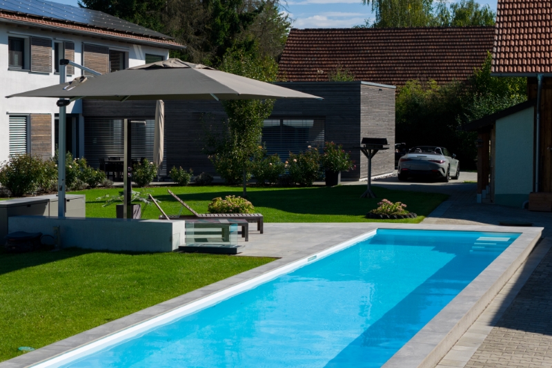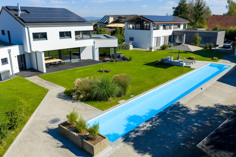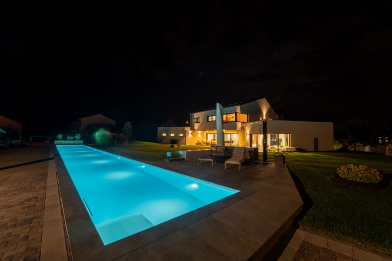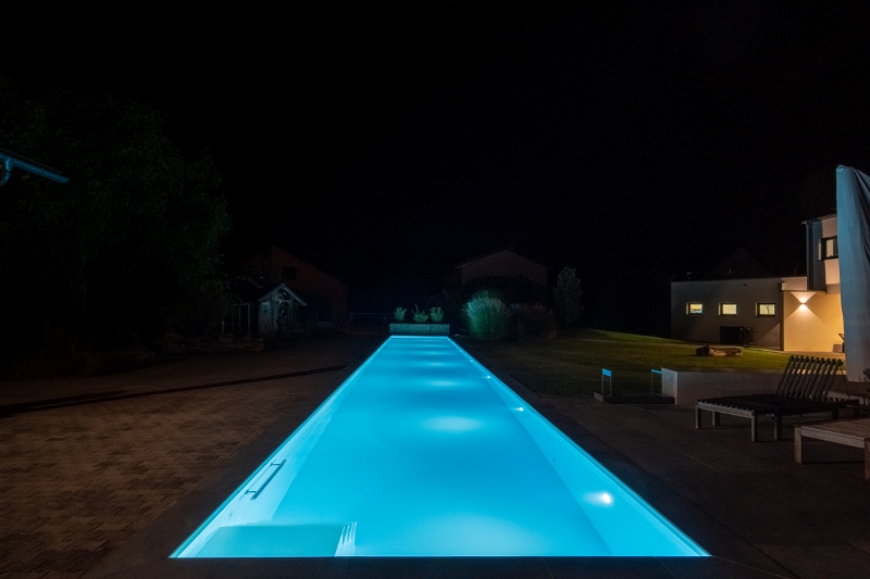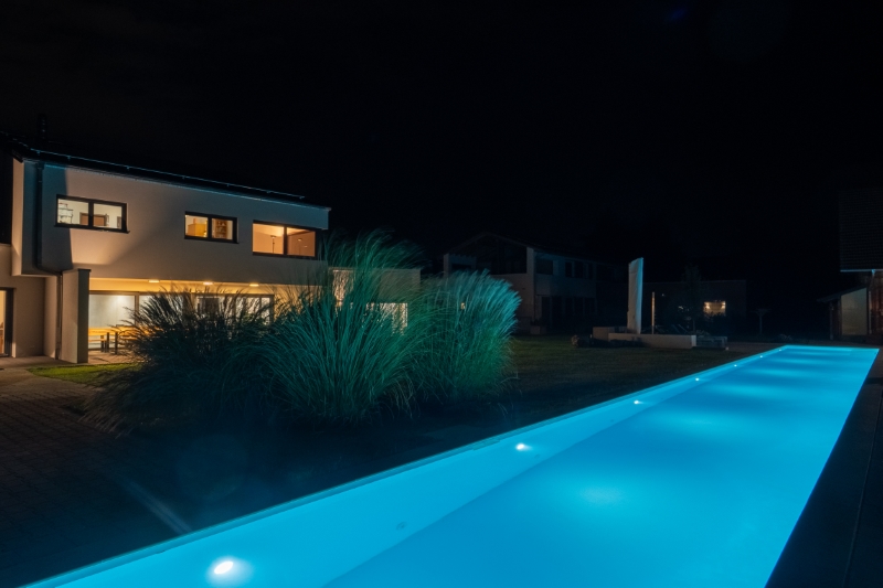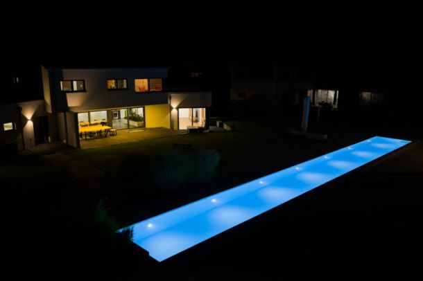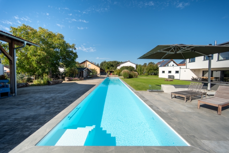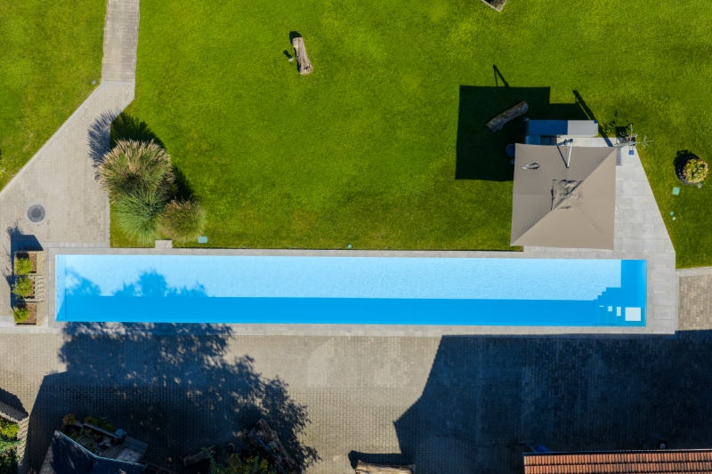 Unser Projekt Laguna überzeugt mit einem weißen Kunststoff-Einstückbecken der Dimension Superlative! Mit den Maßen 26,40 x 3,25 Meter das größte jemals gefertigte Einstückbecken seiner Bauart. Dank seiner Größe eignet sich das Schwimmbad ideal um ungestört lange Bahnen zu schwimmen und gleichzeitig höchsten Komfort in privater Atmosphäre zu genießen. Für Wohlfühlwasser der Extraklasse sorgt dabei die hochwertige, zuverlässige und moderne Ospa Schwimmbadtechnik. Mit der intelligenten Ospa-Smart-Pool Technologie können Beleuchtung, Rollladen, Wasserattraktionen und vieles mehr – ganz bequem per App gesteuert werden. Das Herzstück der Anlage ist die Ospa-Mess- und Regeltechnik, die vollautomatisch alle relevanten Wasserparameter überwacht und regelt. Diese Automatik sorgt dafür, dass die Wasserqualität konstant im optimalen Bereich liegt, ohne dass Sie manuell eingreifen müssen. Zusätzlich sorgt der Ospa-Filteranlage EcoClean dafür, dass Geruchs-, Farb- und Geschmackstoffe effektiv herausgefiltert werden. Zur Poolbeheizung wurde eine flüsterleise Luft-Wärmepumpe installiert, die sehr energieeffizient arbeitet und das Wasser auf angenehme Badetemperaturen bringt. Ein weiterer Komfortaspekt ist die Unterflur-Rollladenabdeckung: Sie hält die Wärme im Becken sehr effizient zurück und lässt sich automatisch via Handy oder Tablet öffnen und schließen. Dadurch werden Wärmeverluste minimiert, besonders nachts oder bei kühleren Temperaturen. Die Gestaltung der Schwimmbadumrandung und Terrassenflächen erfolgte mit hochwertigen Feinsteinzeug-Belägen, die durch Optik und Funktionalität überzeugen – ästhetisch ansprechend, langlebig und rutschfest.