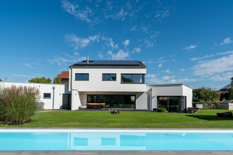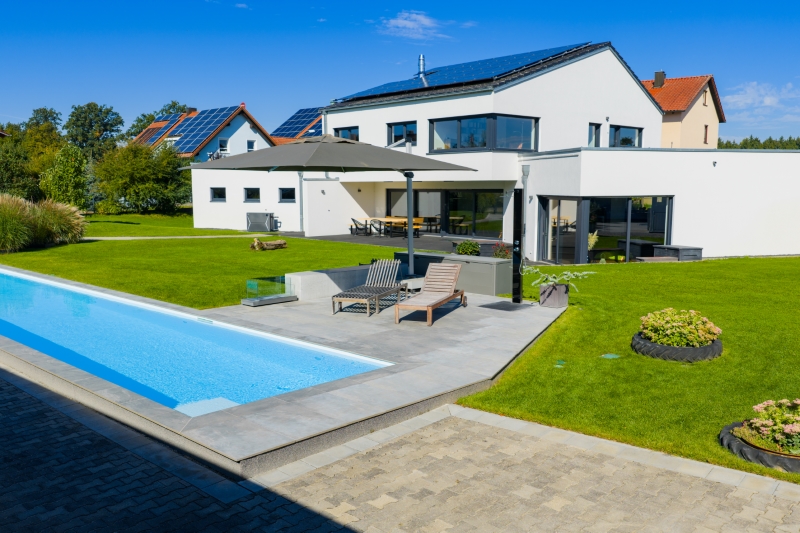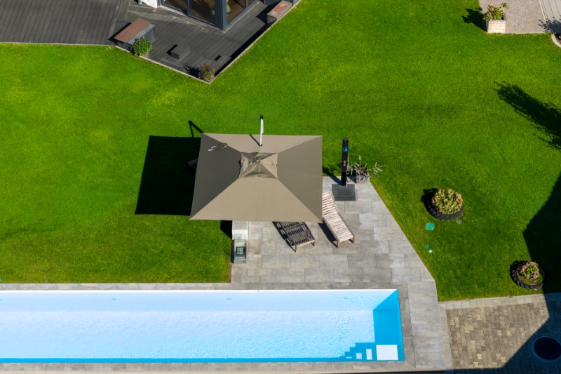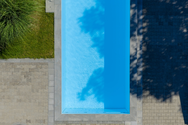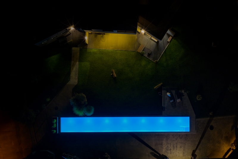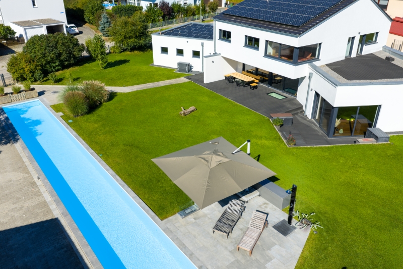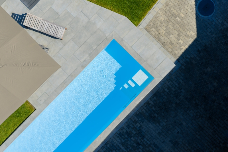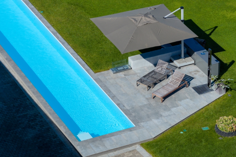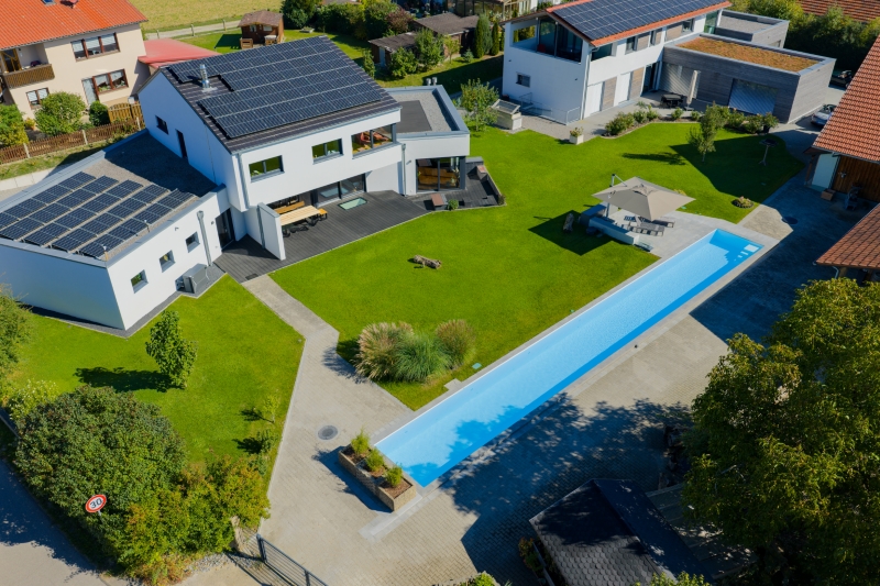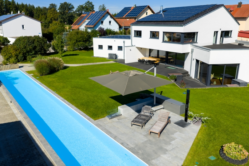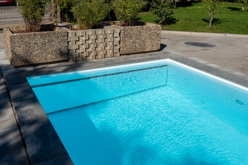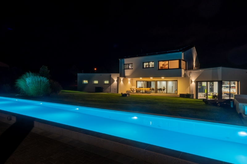 Unser Projekt Laguna überzeugt mit einem weißen Kunststoff-Einstückbecken der Dimension Superlative! Mit den Maßen 26,40 x 3,25 Meter das größte jemals gefertigte Einstückbecken seiner Bauart. Dank seiner Größe eignet sich das Schwimmbad ideal um ungestört lange Bahnen zu schwimmen und gleichzeitig höchsten Komfort in privater Atmosphäre zu genießen. Für Wohlfühlwasser der Extraklasse sorgt dabei die hochwertige, zuverlässige und moderne Ospa Schwimmbadtechnik. Mit der intelligenten Ospa-Smart-Pool Technologie können Beleuchtung, Rollladen, Wasserattraktionen und vieles mehr – ganz bequem per App gesteuert werden. Das Herzstück der Anlage ist die Ospa-Mess- und Regeltechnik, die vollautomatisch alle relevanten Wasserparameter überwacht und regelt. Diese Automatik sorgt dafür, dass die Wasserqualität konstant im optimalen Bereich liegt, ohne dass Sie manuell eingreifen müssen. Zusätzlich sorgt der Ospa-Filteranlage EcoClean dafür, dass Geruchs-, Farb- und Geschmackstoffe effektiv herausgefiltert werden. Zur Poolbeheizung wurde eine flüsterleise Luft-Wärmepumpe installiert, die sehr energieeffizient arbeitet und das Wasser auf angenehme Badetemperaturen bringt. Ein weiterer Komfortaspekt ist die Unterflur-Rollladenabdeckung: Sie hält die Wärme im Becken sehr effizient zurück und lässt sich automatisch via Handy oder Tablet öffnen und schließen. Dadurch werden Wärmeverluste minimiert, besonders nachts oder bei kühleren Temperaturen. Die Gestaltung der Schwimmbadumrandung und Terrassenflächen erfolgte mit hochwertigen Feinsteinzeug-Belägen, die durch Optik und Funktionalität überzeugen – ästhetisch ansprechend, langlebig und rutschfest.