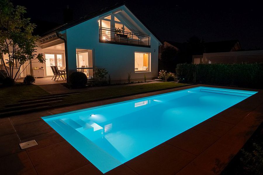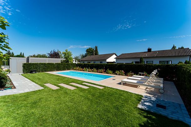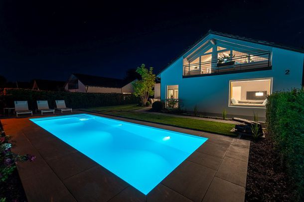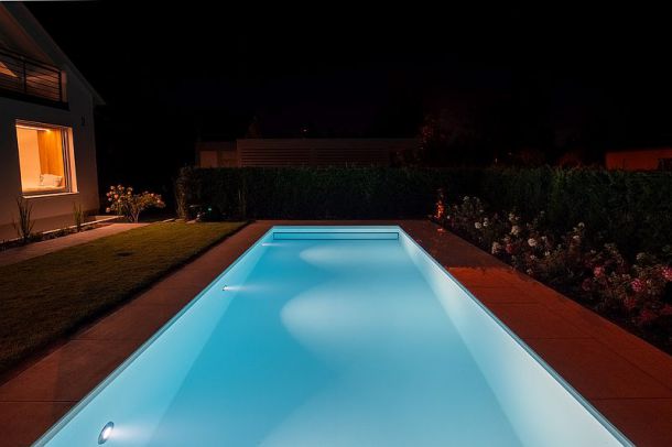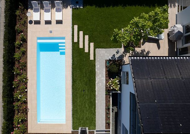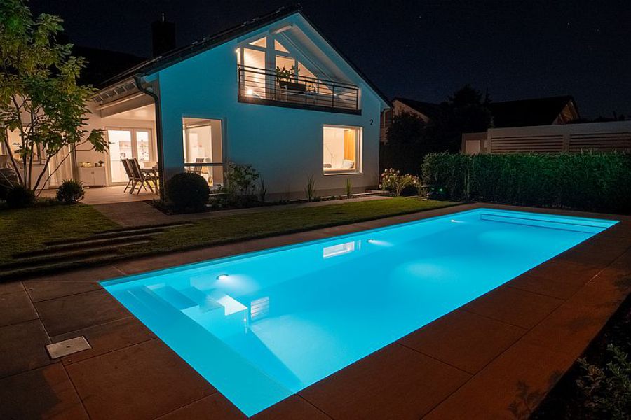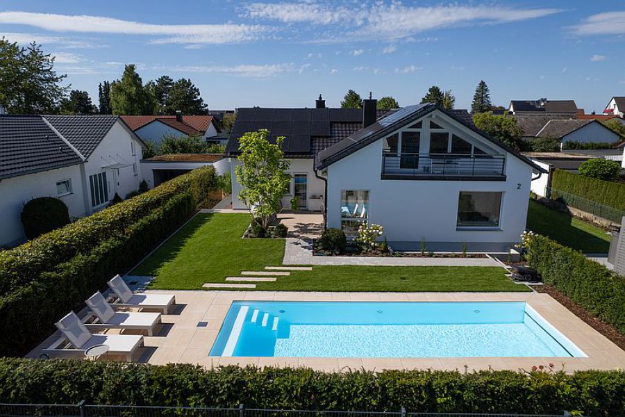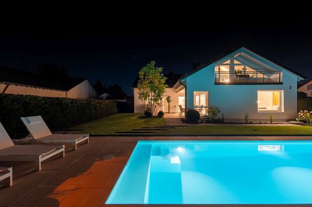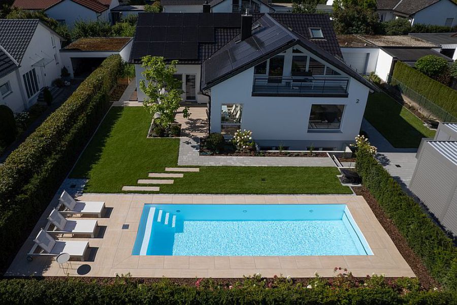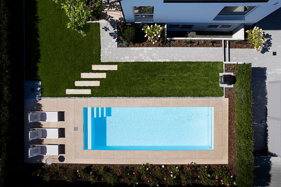 Bei diesem Projekt durften wir einen modernen Pool mit den Maßen 9×3,2m im Garten einer eleganten Vorstadtvilla realisieren. Das Ergebnis: ein Harmonisches Zusammenspiel aus klarer Architektur, stilvoller Gartengestaltung und einem Schwimmbad, das bei Tag und Nacht ein echtes Highlight ist. Ob als Ort der Entspannung, für die Familie oder laue Sommerabende mit Freunden. Dieser Pool vereint Lifestyle und Lebensqualität. Für hygienisch reines Wohlfühlwasser sorgt dabei die vollautomatische Ospa-BlueClear-Anlage. Die Schwimmbadabdeckung wurde in einem Rucksackschacht verbaut und fährt nahezu unsichtbar aus einem kleinen Schlitz in der Beckenwand.