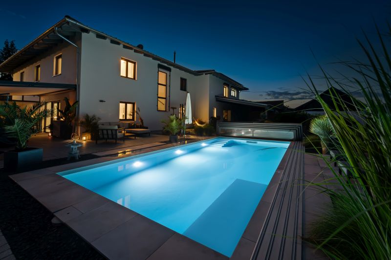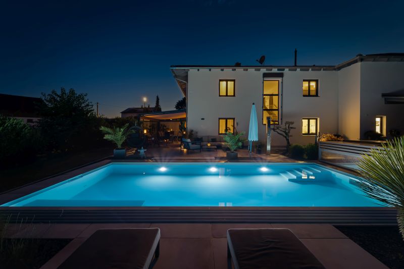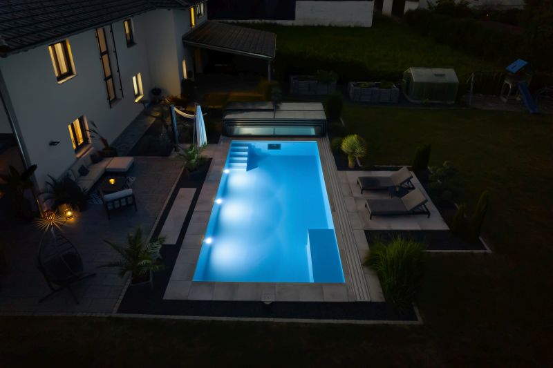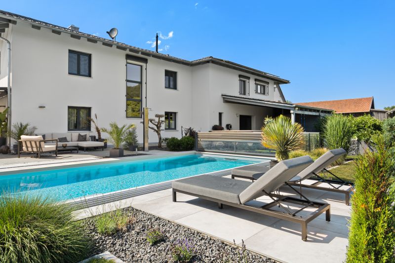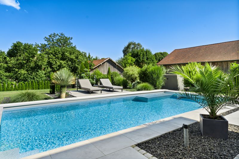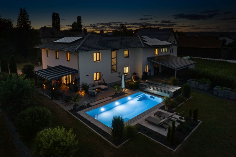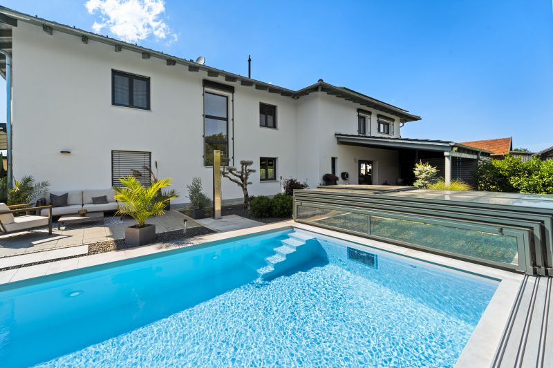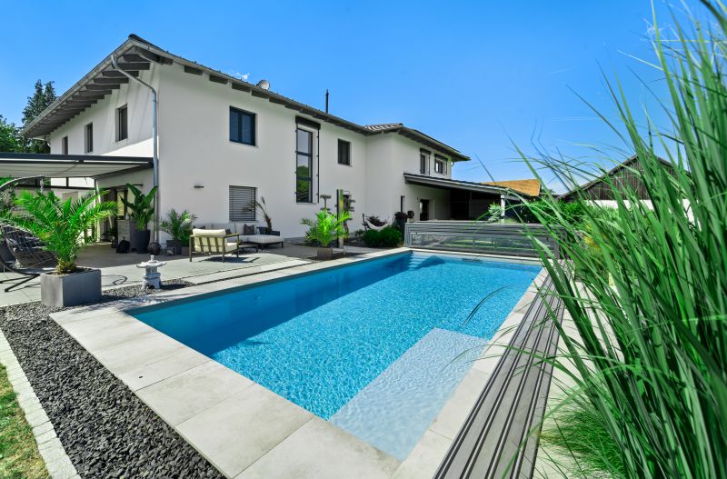 Dieses wunderbare ISOSTONE Massiv Becken mit den Maßen 8,5 x 4 x 1,5m schmiegt sich perfekt in den wunderschön bepflanzten Garten ein. Durch die hellgraue Folienauskleidung funkelt das Becken in einem strahlenden hellblau. Die Gegenstromanlage BINDER Hydrostar macht auch anspruchsvolle Trainingseinheiten für ambitionierte Schwimmer möglich. Nach dem Training kann sich der Schwimmer auf der integrierten Unterwassersitzbank entspannen. Dank des High-Level-Skimmers wird ein sehr hoher Wasserstand erzielt. Längeren Badespaß ermöglicht die unterschwimmbare Überdachung mit einer Höhe von 75cm und einseitiger Bodenschiene. Sie verlängert die Badesaison und spart zugleich Energie. Das Schwimmbad wird mit einer Luftwärmepumpe beheizt.