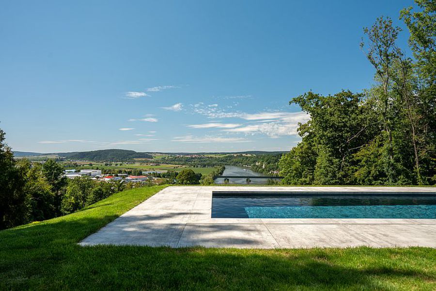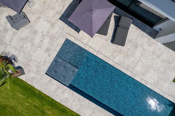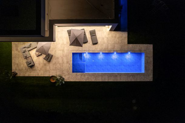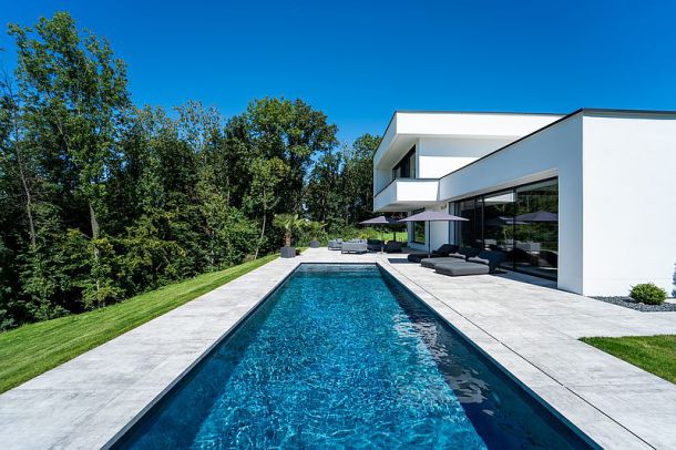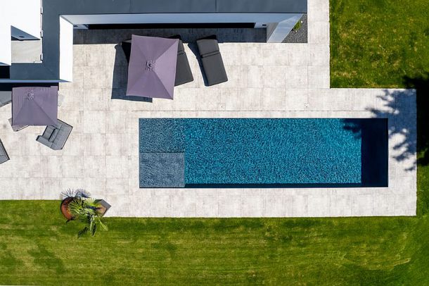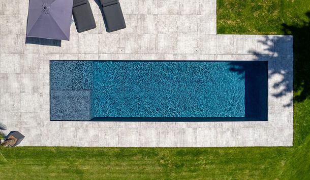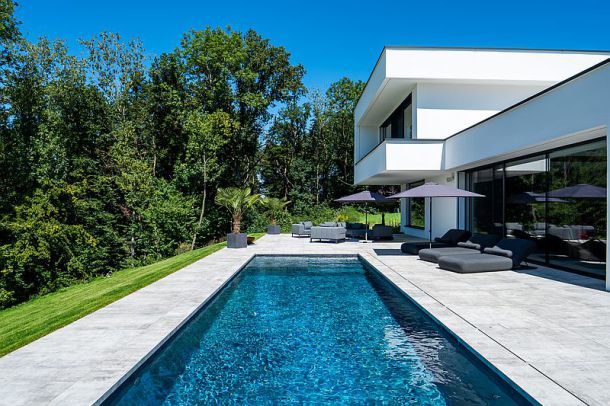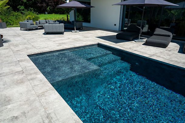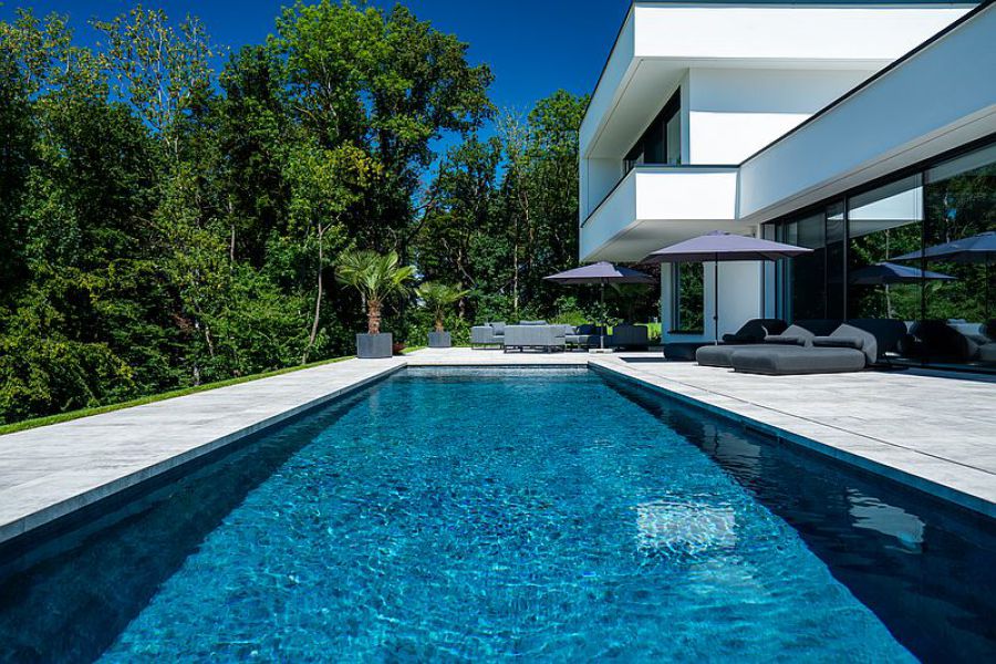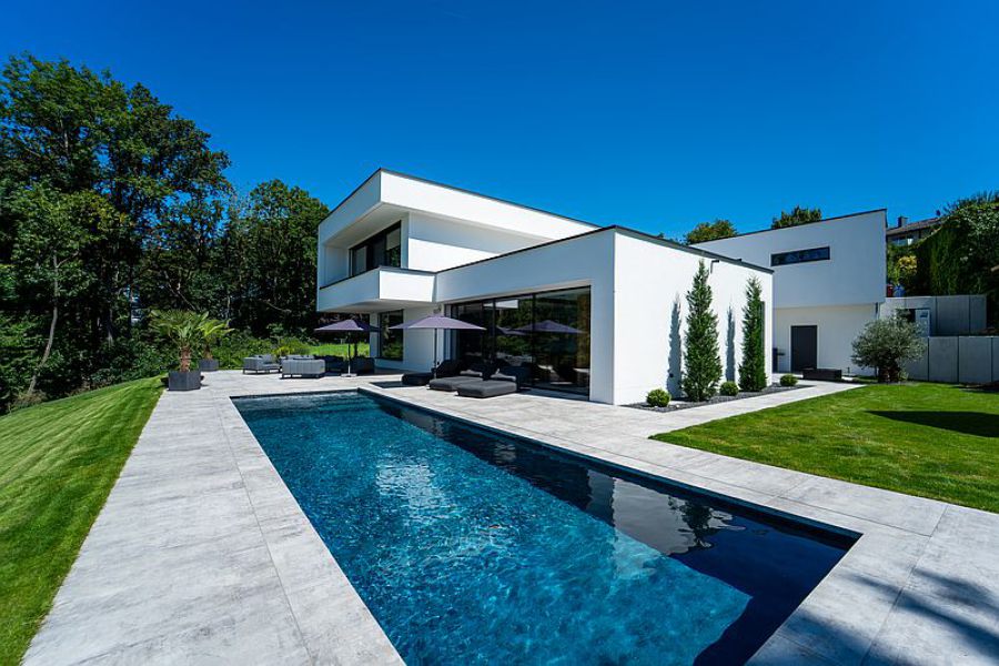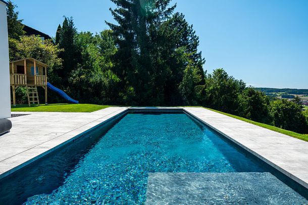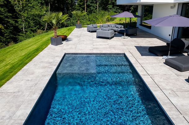 Mit klaren Linien, modernem Design und einem Gesamtensemble das Urlaubsfeeling nach Hause bringt, ist dieses Projekt ein echtes Highlight. Das beheizte Betonschwimmbecken überzeugt nicht nur optisch, durch eine Auskleidung in Naturstein-Schieferoptik, sondern auch durch seine Dimensionen: 13 Meter lang und 3,2 Meter breit inklusive einer integrieten Treppenanlage mit verschiedenen Flachwasserbereichen – perfekt zum Schwimmen, Entspannen und Genießen. Die großzügige Terrasse aus edlen Feinsteinzeugbelägen mit stilvollen Liegen und gemütlichen Loungemöbeln macht den Aussenbereich zu einer wahren Wohlfühloase. Ein Ort, an dem jeder Moment wie ein Kurzurlaub ist.