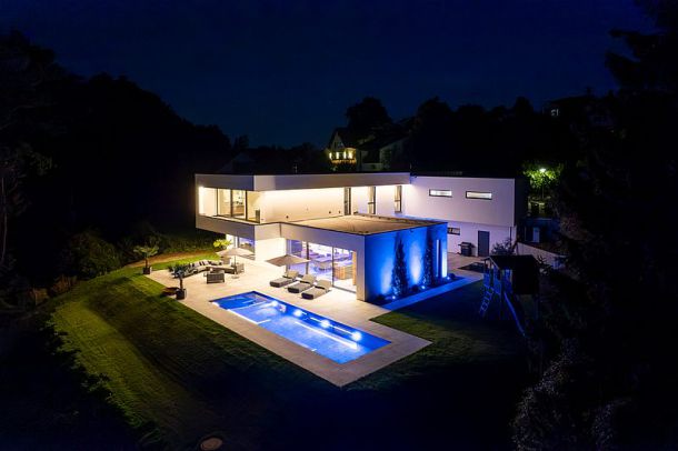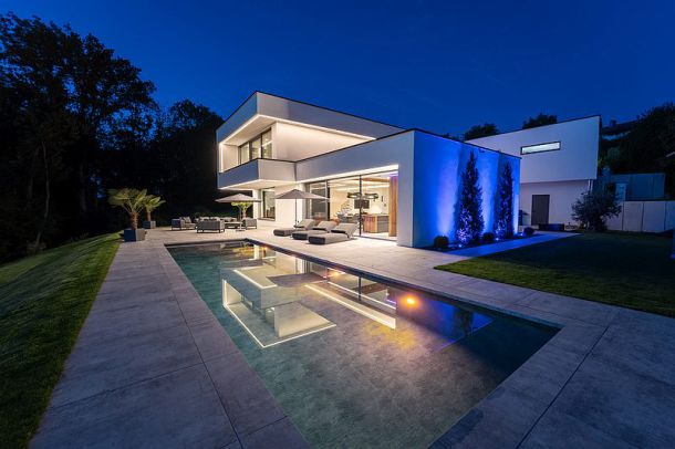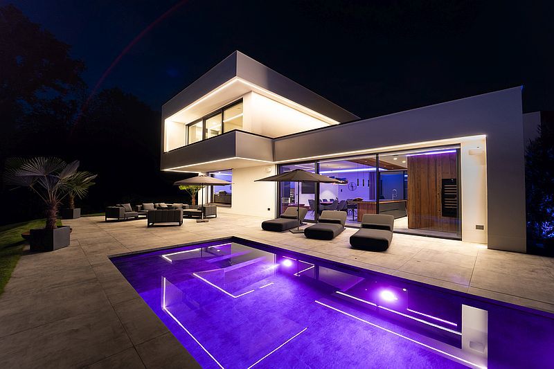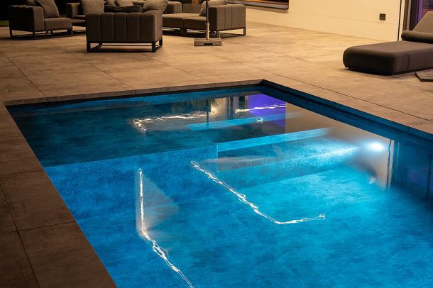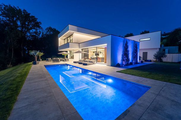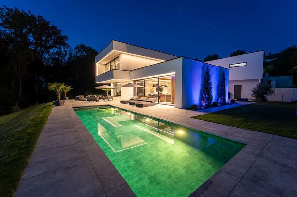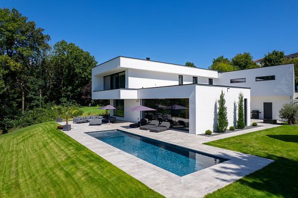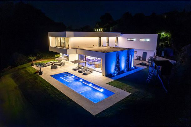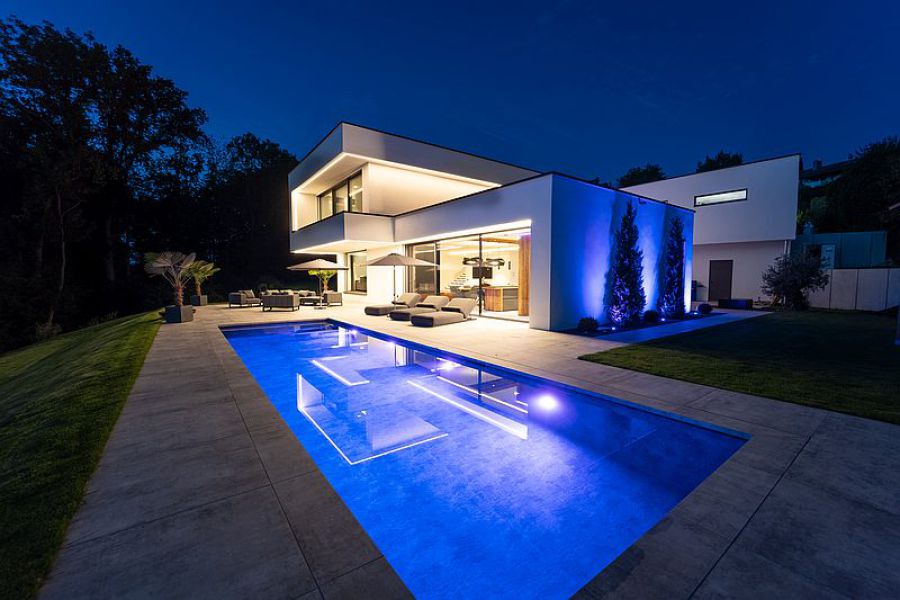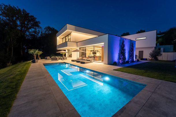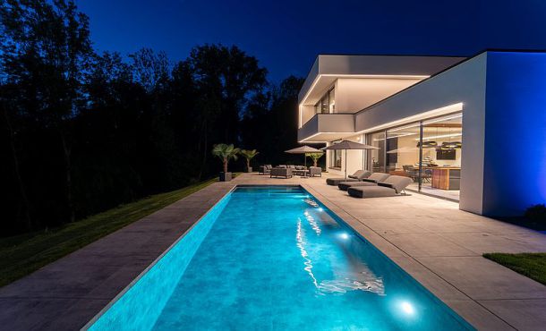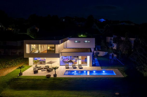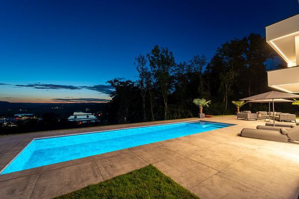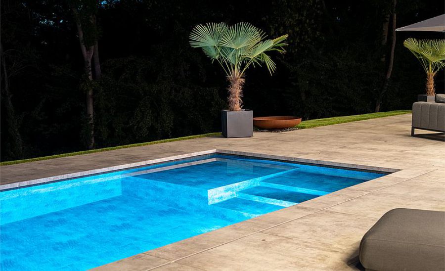 Mit klaren Linien, modernem Design und einem Gesamtensemble das Urlaubsfeeling nach Hause bringt, ist dieses Projekt ein echtes Highlight. Das beheizte Betonschwimmbecken überzeugt nicht nur optisch, durch eine Auskleidung in Naturstein-Schieferoptik, sondern auch durch seine Dimensionen: 13 Meter lang und 3,2 Meter breit inklusive einer integrieten Treppenanlage mit verschiedenen Flachwasserbereichen – perfekt zum Schwimmen, Entspannen und Genießen. Die großzügige Terrasse aus edlen Feinsteinzeugbelägen mit stilvollen Liegen und gemütlichen Loungemöbeln macht den Aussenbereich zu einer wahren Wohlfühloase. Ein Ort, an dem jeder Moment wie ein Kurzurlaub ist.