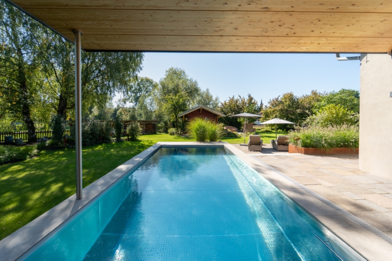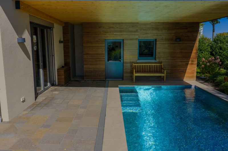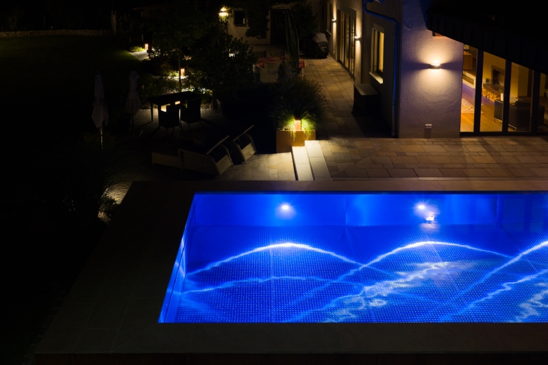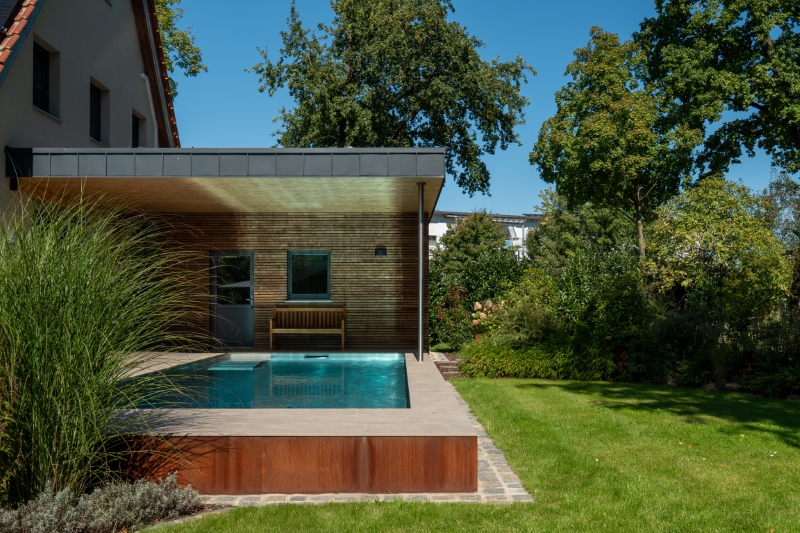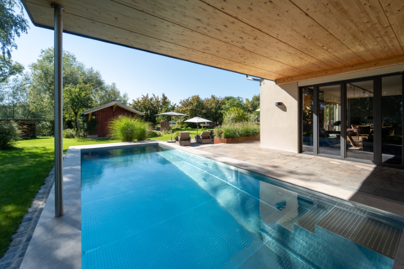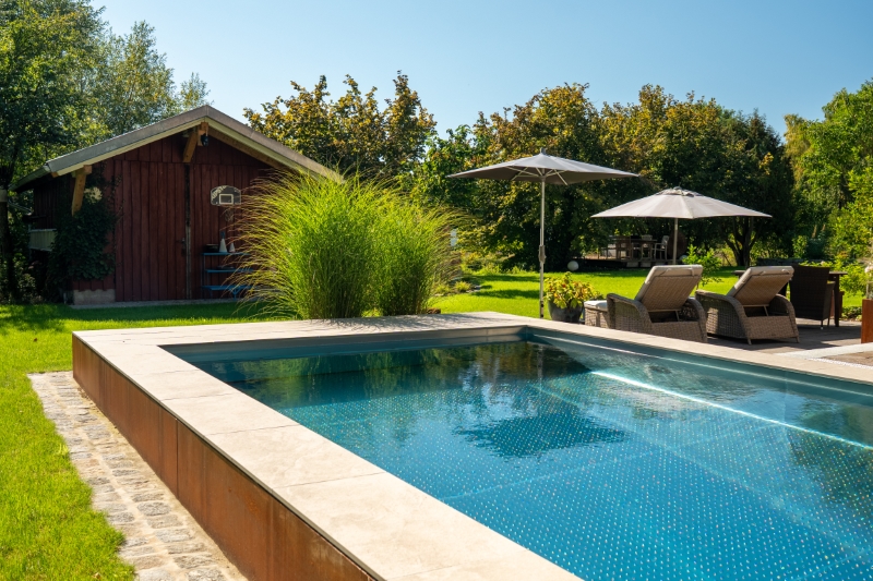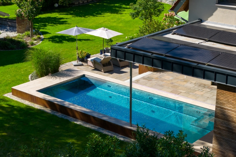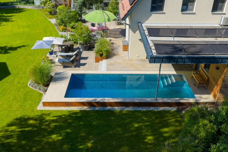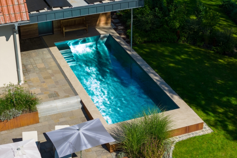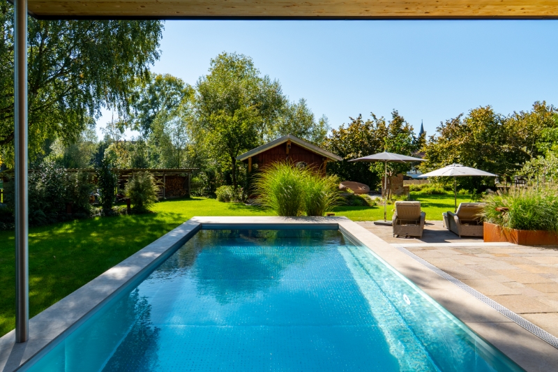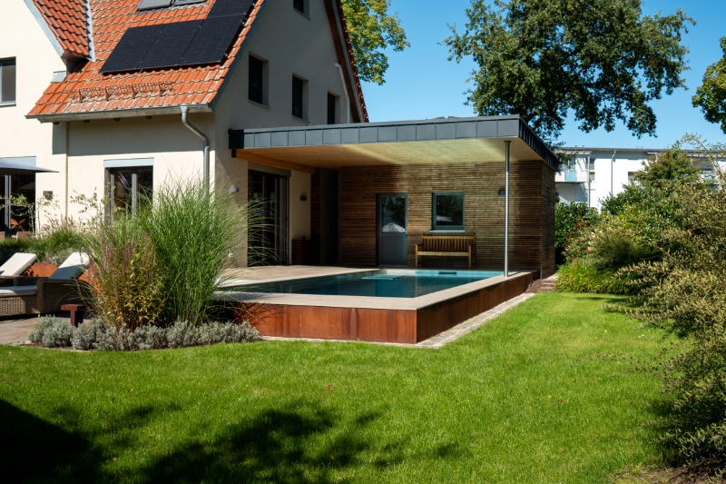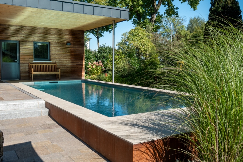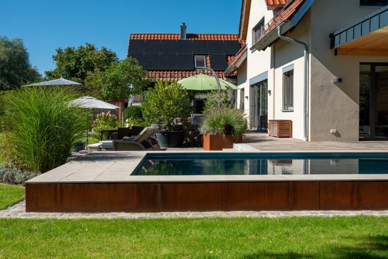 Das Projekt Rivus zeigt, wie sich exklusive Architektur und technische Perfektion auch unter herausfordernden Bedingungen realisieren lassen. Die größte bauliche Besonderheit: die unmittelbare Nähe zum Fluss. Nur wenige Meter entfernt liegt der Wasserspiegel des Flusses – etwa 40 cm tiefer als der Wasserspiegel des Edelstahlpools. Diese Lage verlangte höchste Präzision in Planung und Bauausführung. Optisch überzeugt Rivus mit einer klaren, modernen Gestaltung. Der Poolumgang wurde mit edlen, beigen Feinsteinzeugfliesen eingefasst, die eine warme Atmosphäre schaffen. Da das Becken aus dem Gelände herausragt, wurde die Erhöhung stilvoll mit Cortenstahl eingefasst, was einen spannenden Kontrast aus kühler Eleganz und rustikalem Charme erzeugt. Der Cortenstahl findet sich als Element in der Gartengestaltung wieder. Der Pool ist teilweise überdacht – das Dach ist in das neu errichtete Pool- & Technikhaus integriert, in dem die gesamte Schwimmbadtechnik untergebracht ist. Auch bei Rivus kommt modernste Ospa Schwimmbadtechnik zum Einsatz. Sie sorgt für kristallklares, hygienisches Wasser, höchste Betriebssicherheit und effiziente Ressourcennutzung. Gesteuert wird die gesamte Anlage über das Ospa SmartPool®-System, das die Bedienung kinderleicht über Smartphone oder Tablet ermöglicht. Der Edelstahlpool ist mit einem High-Level-Skimmer ausgestattet, der einen besonders hohen Wasserstand erlaubt. So wirkt die Wasserfläche optisch fast randlos – ein Detail, das die edle Gestaltung zusätzlich betont. Für Energieeffizienz und Sicherheit sorgt die vollautomatische Rollladenabdeckung, die unauffällig im Rucksackschacht verschwindet. Bei unseren Edelstahlbecken setzen wir auf höchste Qualitätsstandards: nicht nur die innenliegenden Bleche bei unseren Becken sind aus V4A-Edelstahl sondern auch die Außenverstrebung ist aus V4A-Edelstahl. Unter dem genoppten Bodenblech verbauen wir ausschließlich Zementestrich und keine Schüttungen o.Ä. um unseren anspruchsvollen Kunden ein dauerhaft wellen- und korrosionsfreies Edelstahlschwimmbecken zu gewährleisten. Nicht nur am Tag ist Rivus ein Statement. Auch nachts wird das Projekt durch eine stimmungsvolle Garten-Beleuchtung und hochwertige LED-Unterwasserscheinwerfer zum echten Highlight. So verbindet dieses Edelstahlbecken klare Architektur mit modernster Technik und schafft eine Atmosphäre, die zu jeder Tageszeit begeistert.