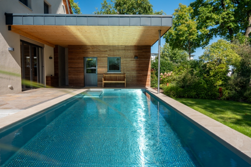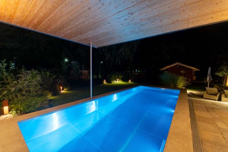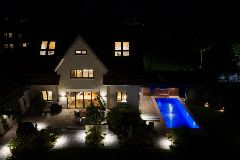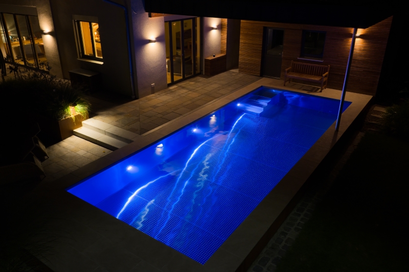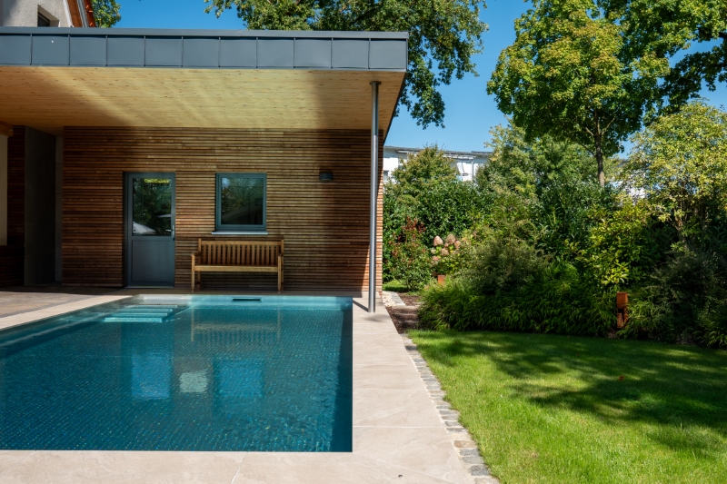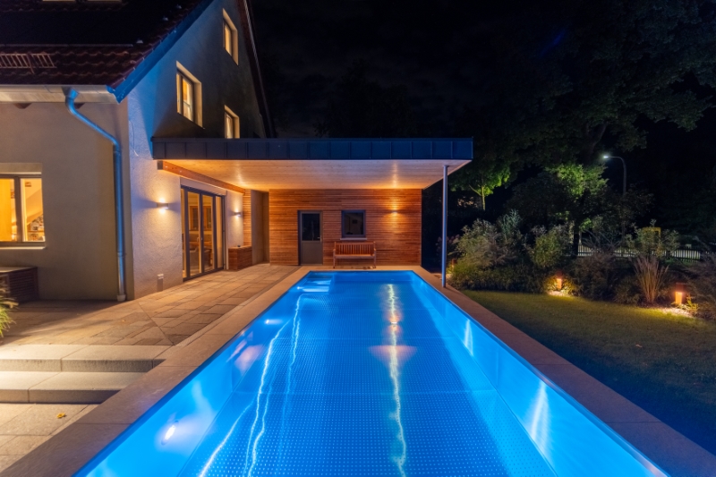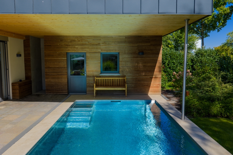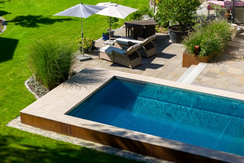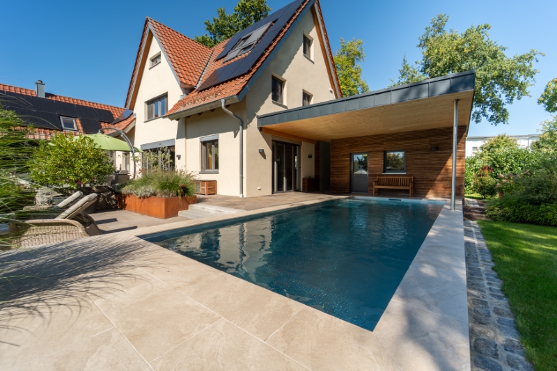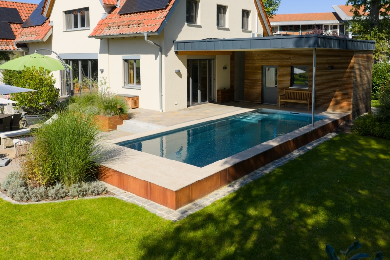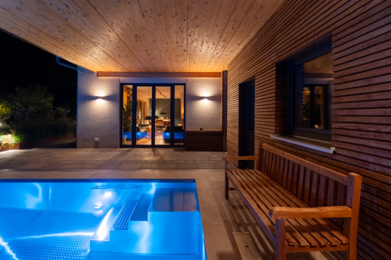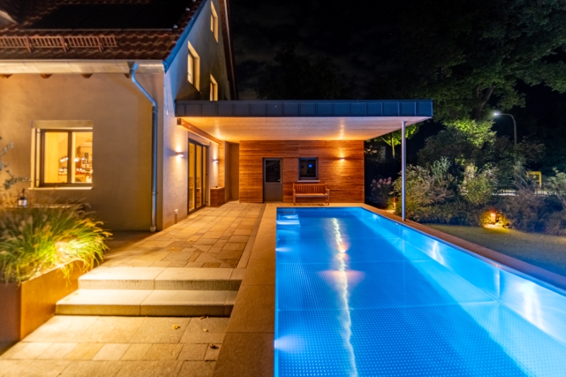 Das Projekt Rivus zeigt, wie sich exklusive Architektur und technische Perfektion auch unter herausfordernden Bedingungen realisieren lassen. Die größte bauliche Besonderheit: die unmittelbare Nähe zum Fluss. Nur wenige Meter entfernt liegt der Wasserspiegel des Flusses – etwa 40 cm tiefer als der Wasserspiegel des Edelstahlpools. Diese Lage verlangte höchste Präzision in Planung und Bauausführung. Optisch überzeugt Rivus mit einer klaren, modernen Gestaltung. Der Poolumgang wurde mit edlen, beigen Feinsteinzeugfliesen eingefasst, die eine warme Atmosphäre schaffen. Da das Becken aus dem Gelände herausragt, wurde die Erhöhung stilvoll mit Cortenstahl eingefasst, was einen spannenden Kontrast aus kühler Eleganz und rustikalem Charme erzeugt. Der Cortenstahl findet sich als Element in der Gartengestaltung wieder. Der Pool ist teilweise überdacht – das Dach ist in das neu errichtete Pool- & Technikhaus integriert, in dem die gesamte Schwimmbadtechnik untergebracht ist. Auch bei Rivus kommt modernste Ospa Schwimmbadtechnik zum Einsatz. Sie sorgt für kristallklares, hygienisches Wasser, höchste Betriebssicherheit und effiziente Ressourcennutzung. Gesteuert wird die gesamte Anlage über das Ospa SmartPool®-System, das die Bedienung kinderleicht über Smartphone oder Tablet ermöglicht. Der Edelstahlpool ist mit einem High-Level-Skimmer ausgestattet, der einen besonders hohen Wasserstand erlaubt. So wirkt die Wasserfläche optisch fast randlos – ein Detail, das die edle Gestaltung zusätzlich betont. Für Energieeffizienz und Sicherheit sorgt die vollautomatische Rollladenabdeckung, die unauffällig im Rucksackschacht verschwindet. Bei unseren Edelstahlbecken setzen wir auf höchste Qualitätsstandards: nicht nur die innenliegenden Bleche bei unseren Becken sind aus V4A-Edelstahl sondern auch die Außenverstrebung ist aus V4A-Edelstahl. Unter dem genoppten Bodenblech verbauen wir ausschließlich Zementestrich und keine Schüttungen o.Ä. um unseren anspruchsvollen Kunden ein dauerhaft wellen- und korrosionsfreies Edelstahlschwimmbecken zu gewährleisten. Nicht nur am Tag ist Rivus ein Statement. Auch nachts wird das Projekt durch eine stimmungsvolle Garten-Beleuchtung und hochwertige LED-Unterwasserscheinwerfer zum echten Highlight. So verbindet dieses Edelstahlbecken klare Architektur mit modernster Technik und schafft eine Atmosphäre, die zu jeder Tageszeit begeistert.