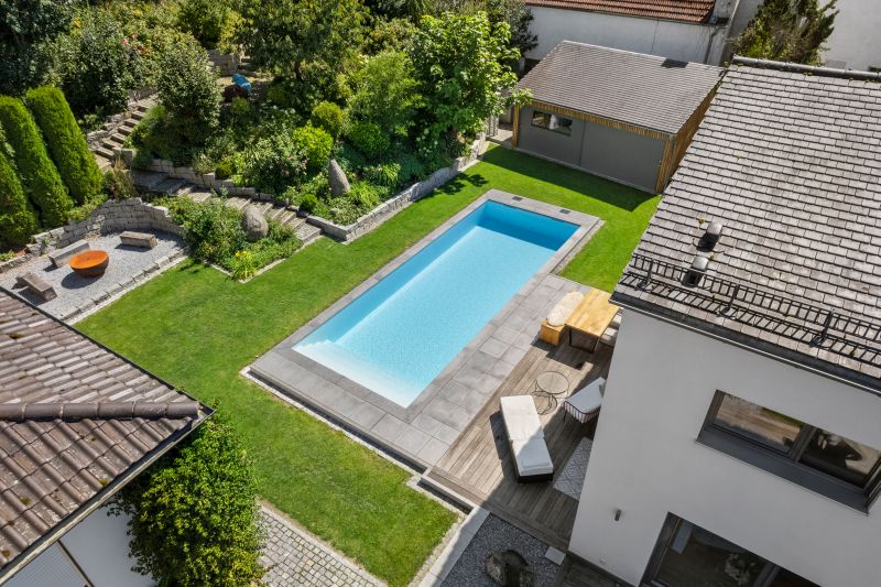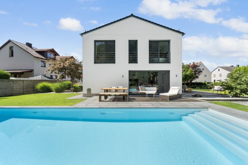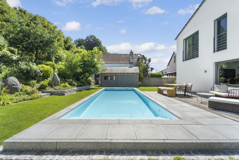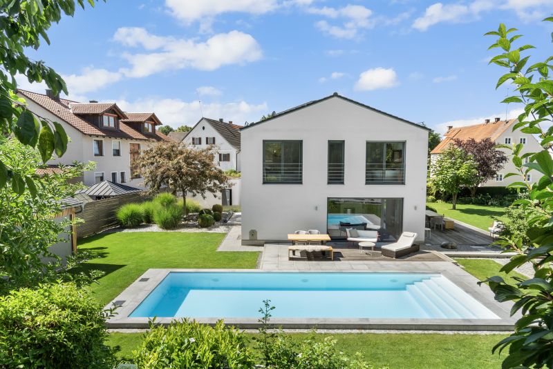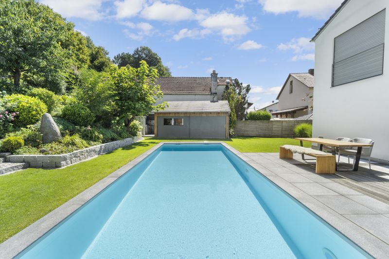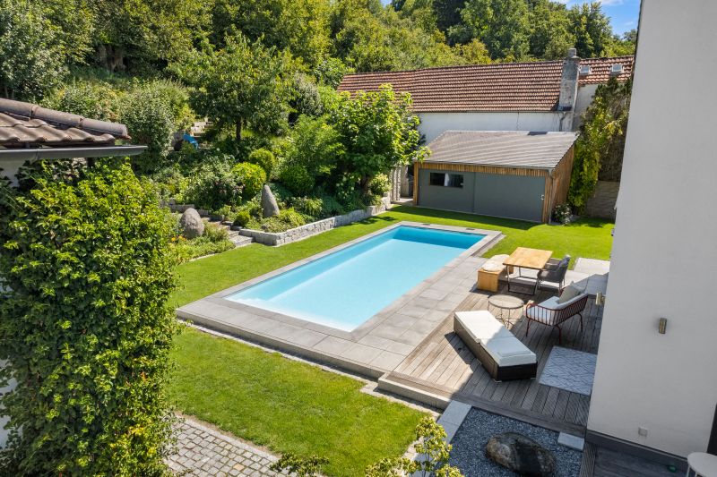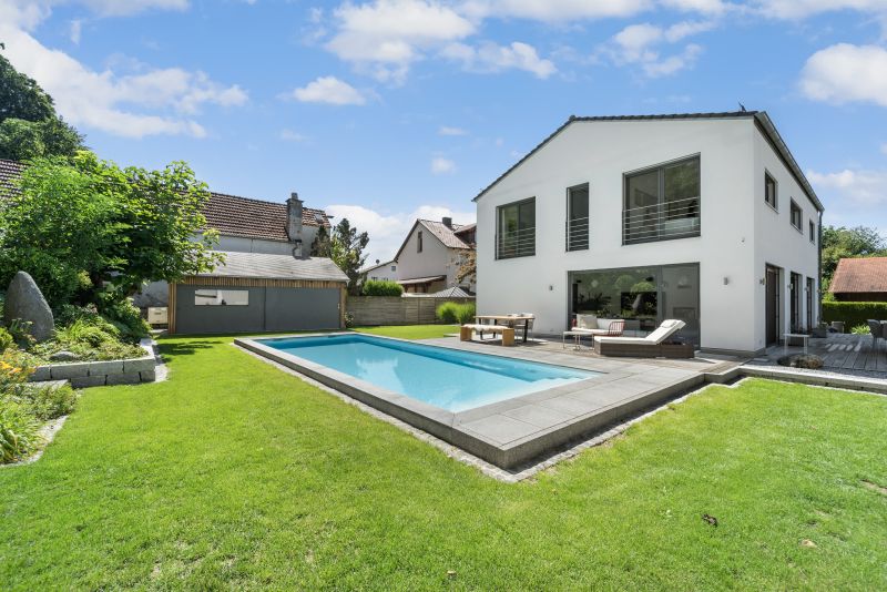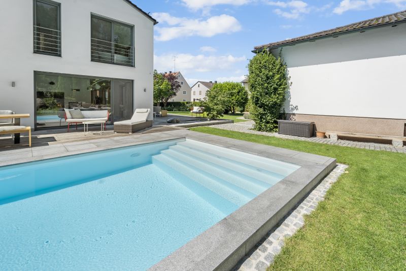 Ein Pool der Extraklasse ist auf diesem Grundstück nahe München entstanden. Ein Ort der Erholung und eine Oase des Wohlfühlens in einer traumhaft gestalteten Umgebung. Wohnhaus und Schwimmbad sind hier eine harmonische Verbindung eingegangen. Ein besonderes Highlight bei diesem 10,00×3,70m großen Polystone Schwimmbad ist die großzügig gestaltete Eingangstreppe über die ganze Beckenbreite die zugleich mehrere Sitz- und Liegemöglichkeiten für die Badegäste bietet. Eine Vollautomatische Filter- und Dosiertechnik sorgt für ungetrübten Badespaß. Dank des High-Level-Skimmers wird ein sehr hoher Wasserstand erzielt. Eine energieeffiziente Full-Inverter Wärmepumpe in Verbindung mit einer Photovoltaikanlage sorgt für eine nahezu kosten- und emissionslose Beheizung des Pools von Mai-September.